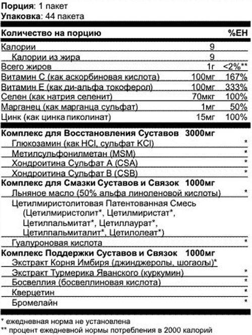 - Комплекс строительных веществ 3000 мг: глюкозамин, хондроитин, метилсульфониметан (MSM).