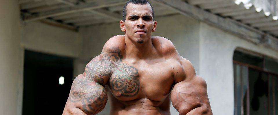 Этого бразильского культуриста зовут Ромарио Дос Сантос Алвеш. Он прославился тем, что чуть не потерял обе руки из-за злоупотребления синтолом и сильного кальцевание мышц.