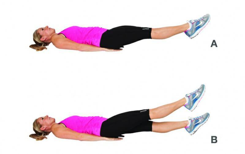 Лёжа на полу нужно поднять верхний корпус. Поясница должна строго лежать на полу. Согнув ножки, приподнимите их над уровнем пола. Задержитесь в таком положении на минуту. Повторите десять раз.