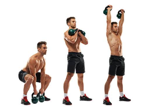 Ноги расставлены по бокам. В выпрямленной руке между ног удерживают гирю, а ноги немного сгибают в коленном суставе. Гирю резким движением поднимают вперед так, чтобы между снарядом и корпусом образовался прямой угол. Нужно следить за тем, чтобы спина оставалась прямой в верхней крайней точке. На каждую руку делают до 8 повторов. В мышцах должно чувствоваться напряжение.