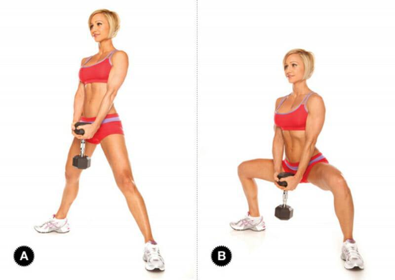 Широкая постановка ног во время приседаний позволяет прицельно нагрузить бицепсы бедер и ягодицы. Для женщин, только приступивших к силовому тренингу, выполнять упражнение можно без отягощения. Для девушек, обладающих определенным уровнем спортивной подготовки и мужчин рекомендуется производить присед с гантелей.