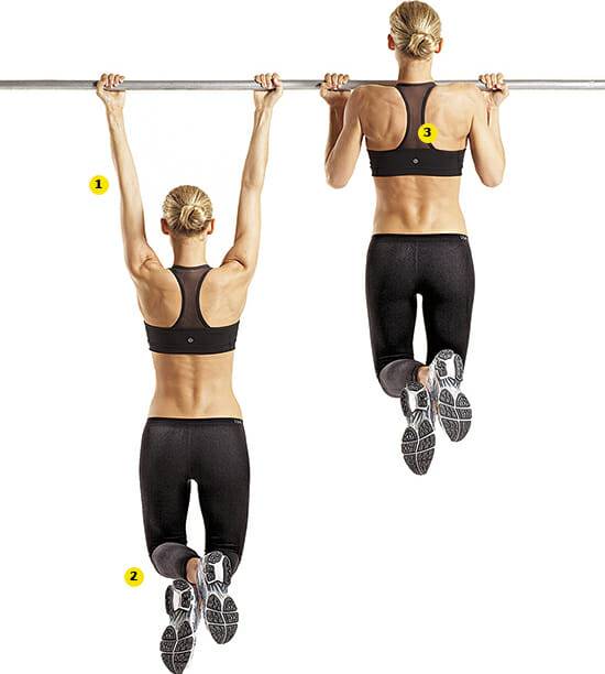 Руки, подтягиваясь, держат немного шире, чем плечи. Чтобы повысить эффективность, на пояс вешают отягощение. Количество повторов стараются делать столько, сколько позволяет собственная физическая подготовка.