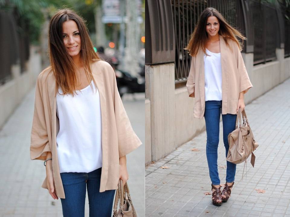 - топы без рукавов или на тонких бретелях в сочетании с кардиганами и жакетами;