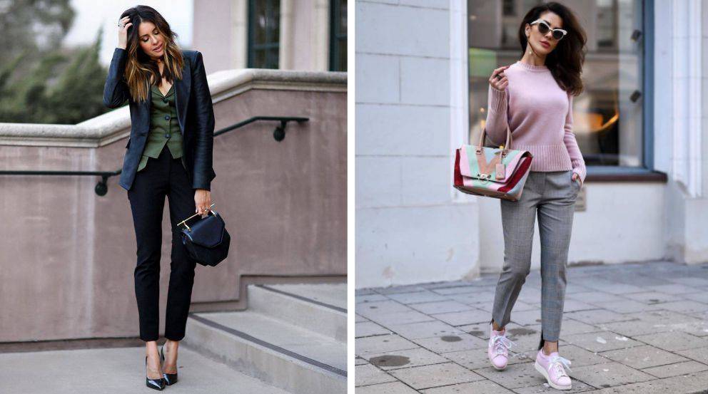 Всегда уместны классические черные брюки, допустимый вариант зауженные, расклешенные или укороченные модели. Цвет должен быть однотонным — коричневый, чёрный, тёмно — синий, марсала. Если есть в гардеробе брюки с принтом, рекомендуется выбирать нейтральный вариант. Что касается материала, то брюки из эластичных тканей обеспечат максимальный комфорт.