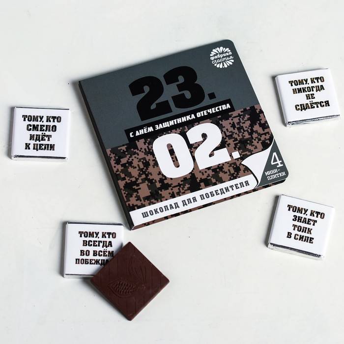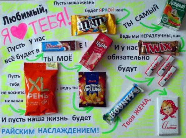 А вот открытка, изготовленная из шоколада, да еще и с написанным на ней именем мужчины наверняка удивит любого. Можно обойтись без указания имен, но написать оригинальное поздравление. Кроме шоколада, существуют также наборы, состоящие из банок с медом, именных конфет и т. д.