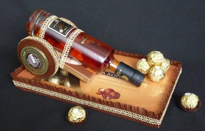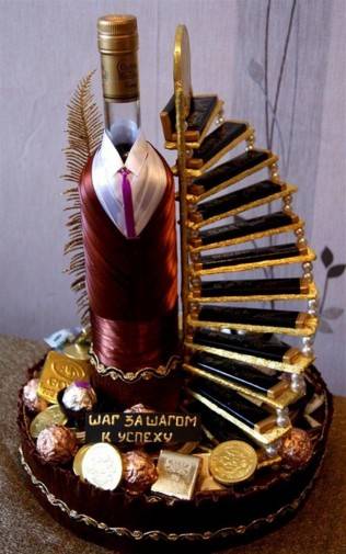 Если вы обладаете креативными способностями, то вы можете воссоздать что-нибудь интересное, например взять дорогой ликер или коньяк и оформить его, как лестницу исполнения желаний. Вообщем будет оригинально, но недорого.