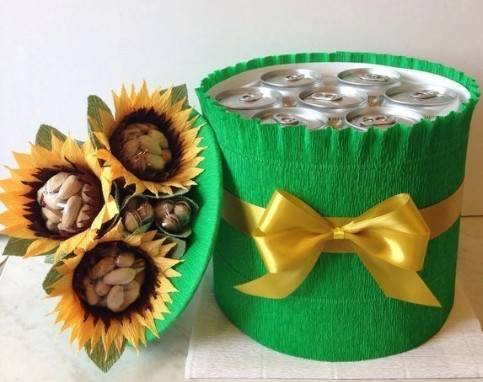 Даже обычное пиво и орешки, можно вот так оформить и украсить при помощи гофрированной бумаги и бантика.