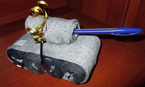 Хотя носки – стереотипный подарок, часто что-то обычное бывает полезней сложных подарков, к тому же не всегда найдутся средства на дорогую затею. Но даже простой подарок можно оформить и преподнести оригинально. Достаточно купить несколько распространенных подарков и сделать из них красивый подарочный набор: носки, трусы, галстуков, мыло, кошелек, ручку положить в красивую коробочку, добавить декора. Не обязательно класть в коробочку все перечисленное. Такой подарок имеет свою особенность: приятно рассматривать всякие разности. Согласитесь, какая-то одна вещь выглядела бы не так празднично, как целый набор нужных вещиц. Есть еще парочка оригинальных сюрпризов с не совсем оригинальными вещами. Купите несколько пар носков и выложите из них поздравление «С 23 февраля», либо сделайте танк и обвяжите ленточкой. Из носков, как из банок от пива, можно сделать букет и даже торт.