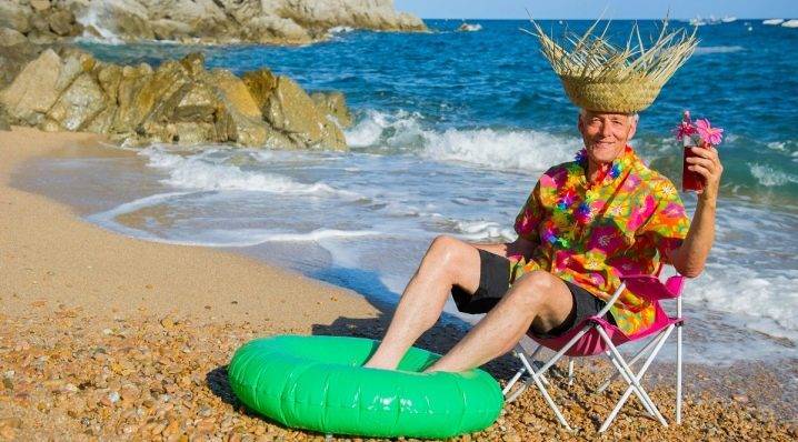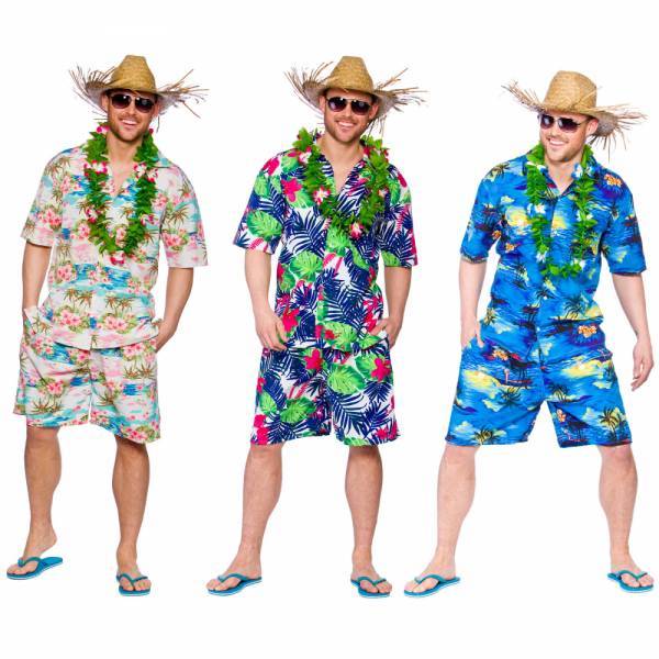 Мужчины облачаются в пестрые гавайские рубашки с короткими рукавами. Нижнюю часть костюма составляют шорты до колен или тонкие легкие брюки, которые можно слегка подвернуть снизу. Дополняет мужской look широкополая шляпа, легкая панама. На ноги лучше надеть легкие кожаные туфли.