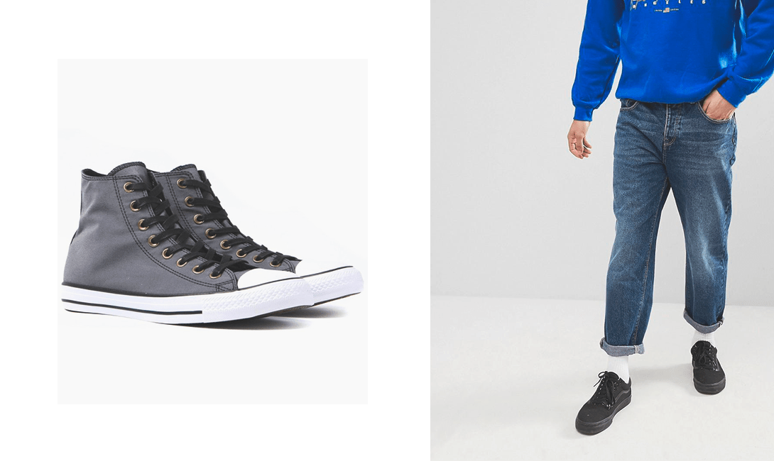 Самое распространенное сочетание, конечно же, кеды с джинсами — тут ты точно не прогадаешь. Правда, если речь идет о высоких кедах, лучше выбрать брюки с отворотами, узкие джинсы или шорты (отличный летний вариант).