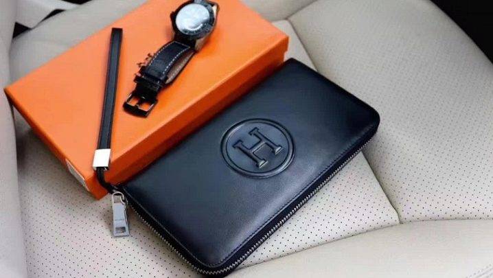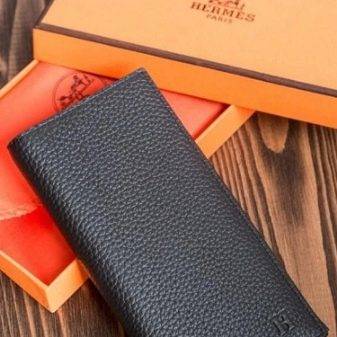 Застёжка оригинальных изделий бывает двух видов: буква Н или круглая металлическая кнопка с гравировкой имени бренда. Кожа портмоне очень мягкая и приятная, она легко поддаётся надавливанию и быстро возвращается в первоначальный вид, не оставляя вмятин. Компания Hermes предоставляет исключительно монохромные мужские портмоне, никаких цветных вставок.