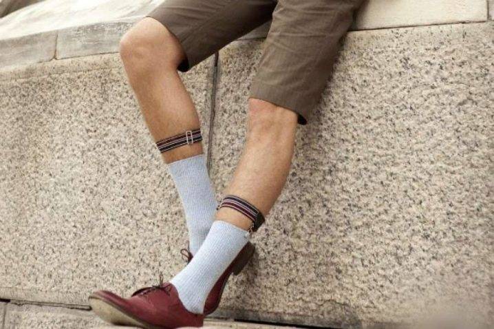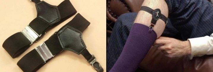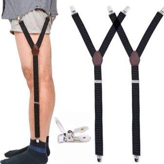 Конструкция похожа на помочи для брюк, но имеет более скромные размеры и выпускается парой. Эластичная лента или ремешок крепятся к икре или бедру, от нее по обе сторон отходят полосы, на конце которых размещаются зажимы. Их крепят на носках.
