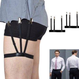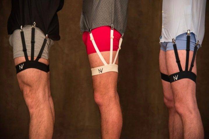 Конструкция представляет собой эластичную ленту или ремень, которые крепят на бедре, а от нее отходит несколько полос с зажимами, цепляющими рубаху спереди, сбоку и сзади. Существует и другая интересная вариация подтяжек для рубашек. Это ленты, которые вверху крепятся к рубахе, а внизу – к носкам