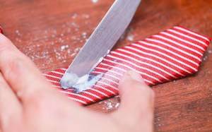 - Из толстого и плотного картона нужно вырезать трафарет по контуру галстука и засунуть внутрь изделия, чтобы во время стирки оно не мялось, а волокна ткани не растрёпывались. Трафарет предварительно обернуть плёнкой, чтобы картон не размок.