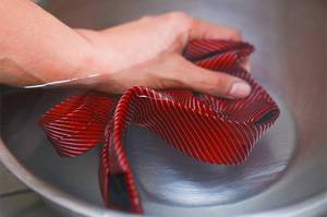 - Определите, не линяет ли ткань, перед тем как стирать мужские галстуки. Сделать это просто: влажной светлой материей потрите галстук на малозаметном участке. Если на тряпочке не осталось следов, значит изделие выдержит и машинную стирку. В противном случае допускается только ручная.