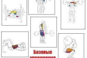Базовые упражнения — это упражнения, при выполнении которых задействуются несколько мышц и суставов одновременно. Например: жим штанги лежа, при его выполнении задействуются грудные мышцы, трицепсы, передние дельты.