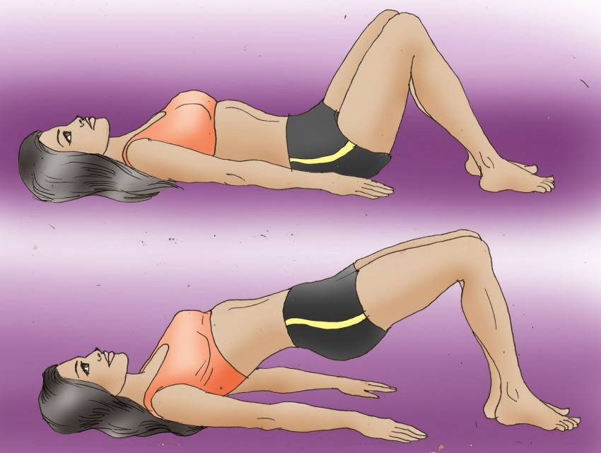 - Исходное положение: лежа, руки по швам, ноги согнуты в коленях. Оторвите спину и ягодицы от пола и снова опуститесь. На подъеме делайте выдох, на опускании – вдох.