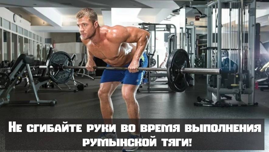 В румынской тяге, все движения происходит за счет работы ягодичных мышц. Если же вы начнете сгибать руки во время подъема. Упражнение превратится в ТЯГУ ШТАНГИ В НАКЛОНЕ. И большая часть нагрузки начнет уходить в широчайшие мышцы спины. А нам этого не надо.