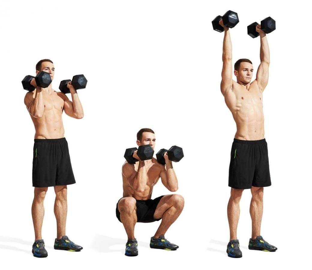 Выполняя этот вариант упражнения, вам понадобится две гантели, вес каждой должен быть не менее 2,5 кг. Гантели держите на уровне груди и выполнять упражнение, как описано выше.