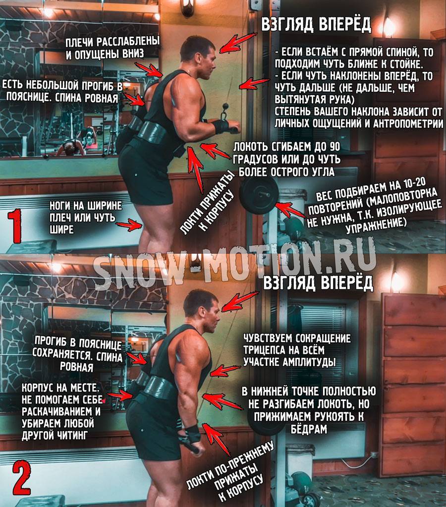 - При возвращении руки в исходное положение, не надо полностью сгибать руку в локтевом суставе. Это снимите нагрузку с трицепсов и перенесет ее на бицепс. Достаточно сохранять в локте угол в 90°.