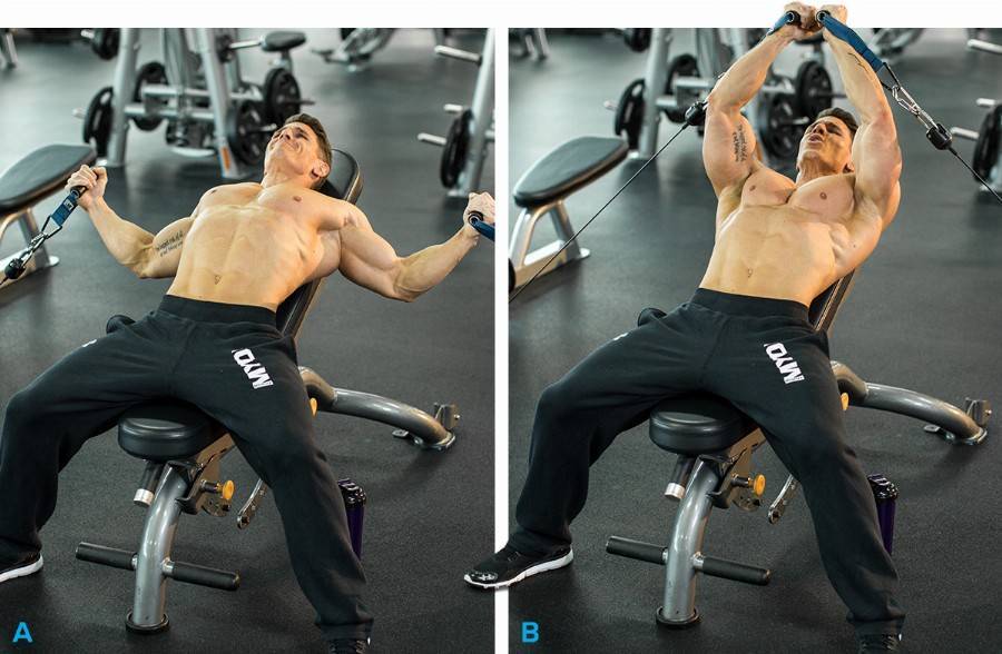 - Подайте грудь немного вперед и вверх, а плечи отведите назад – так вы снимите с них большую часть нагрузки и сможете сконцентрироваться на изолированной работе верха груди.